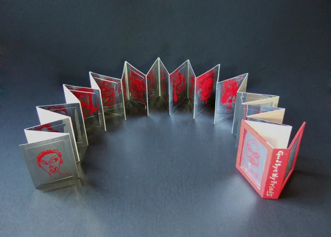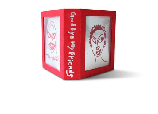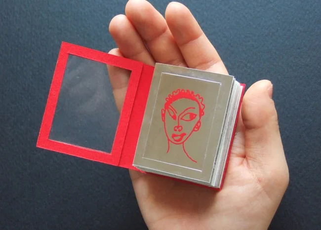 This is a visual language and performance book. On each page made of a piece of mirror paper the illustration of my friends' faces was silkscreened. My face is reflected on it when I look at one of page, and I can have conversation with my friends visually. Each page can be detached to be given for a friend. When all faces of my friends are detached, only the frame of the book leaves.